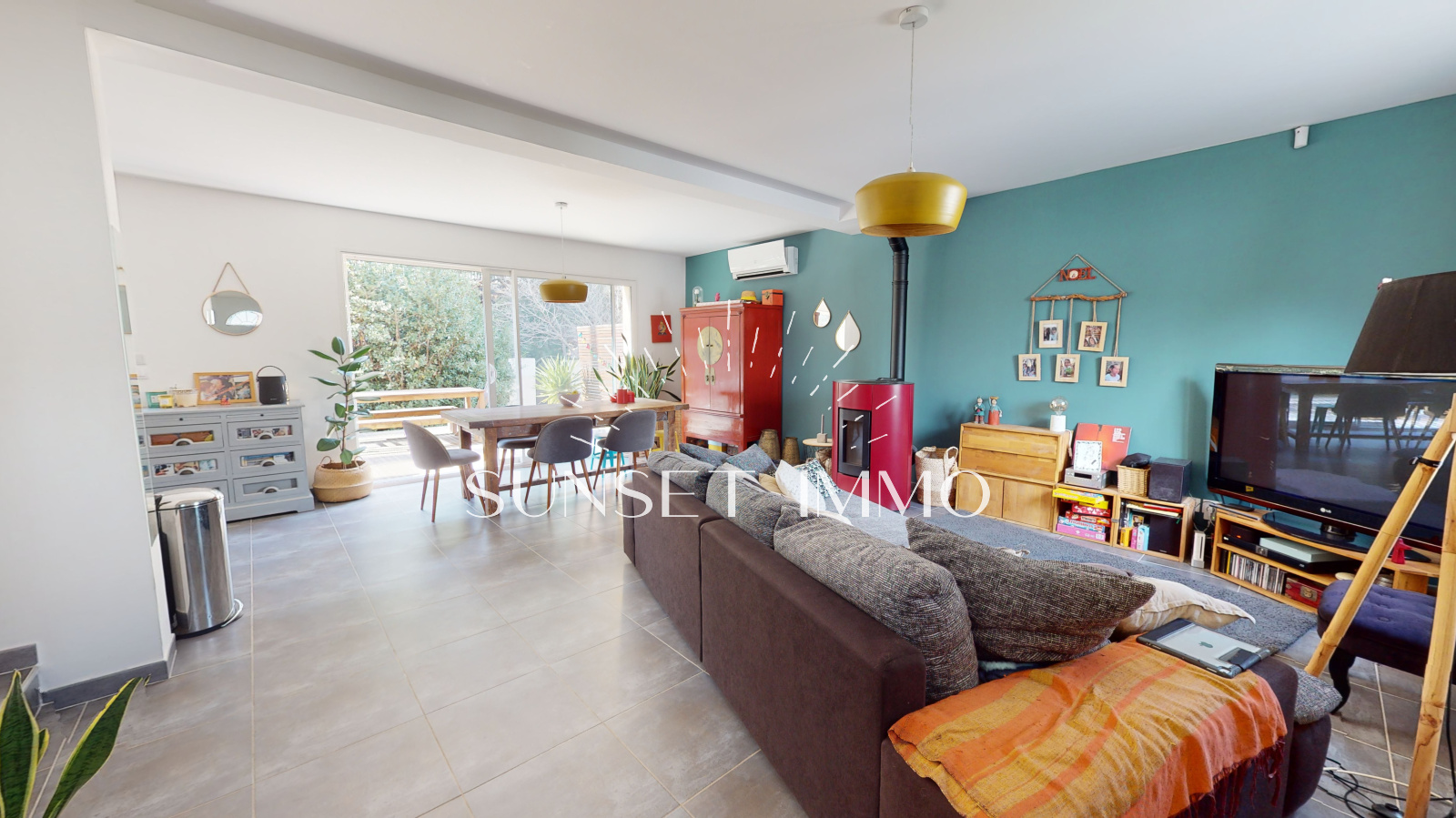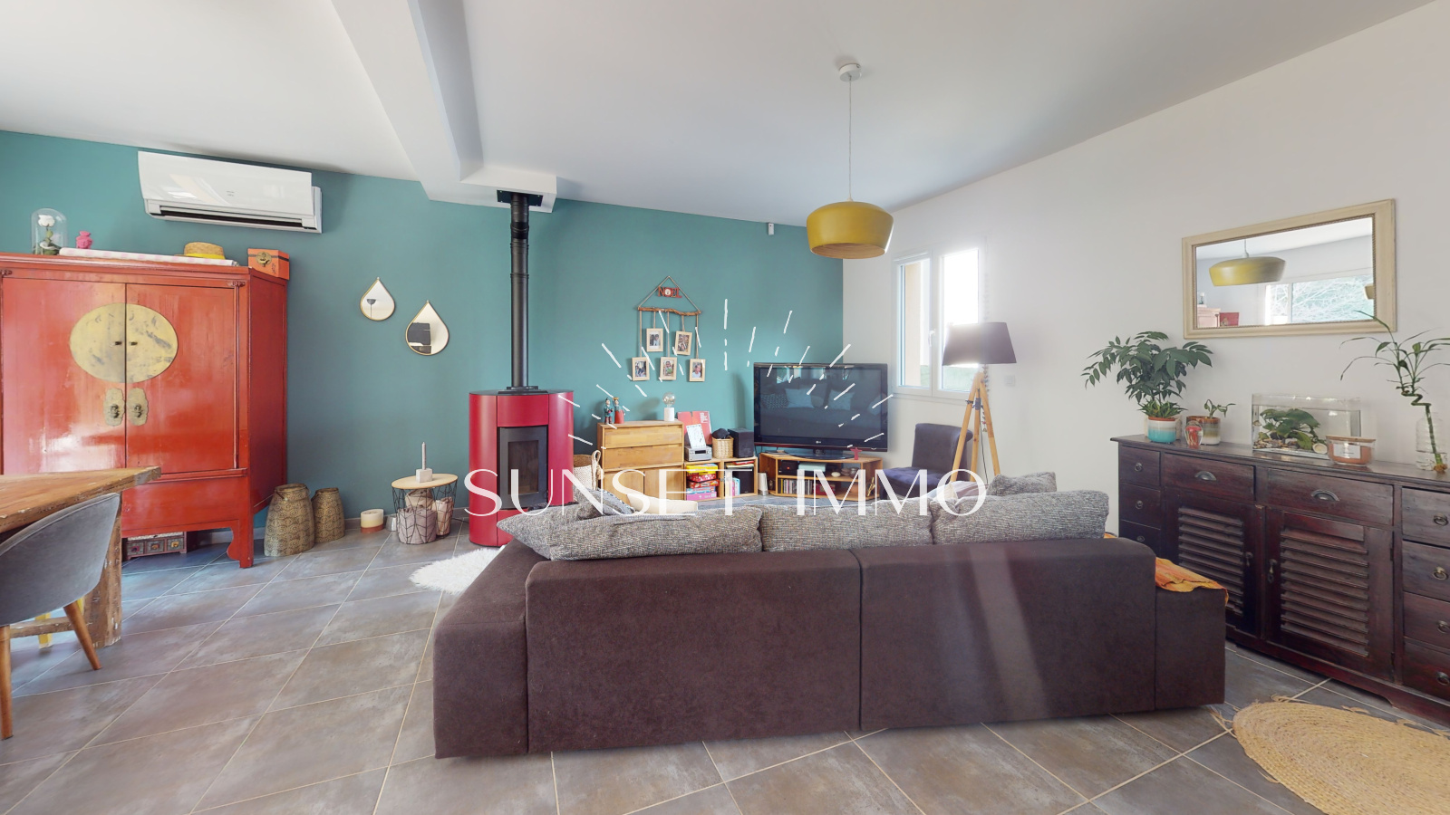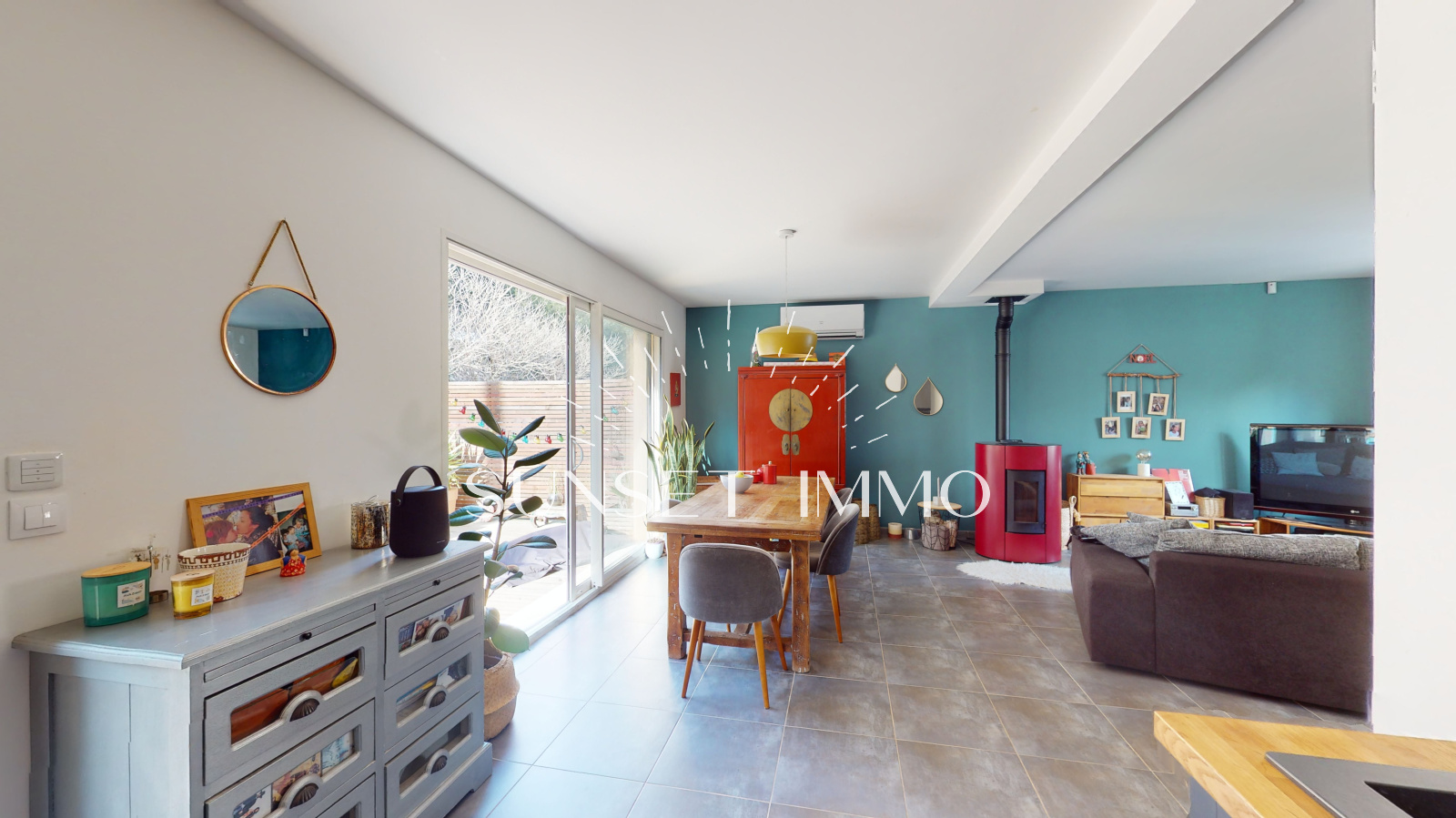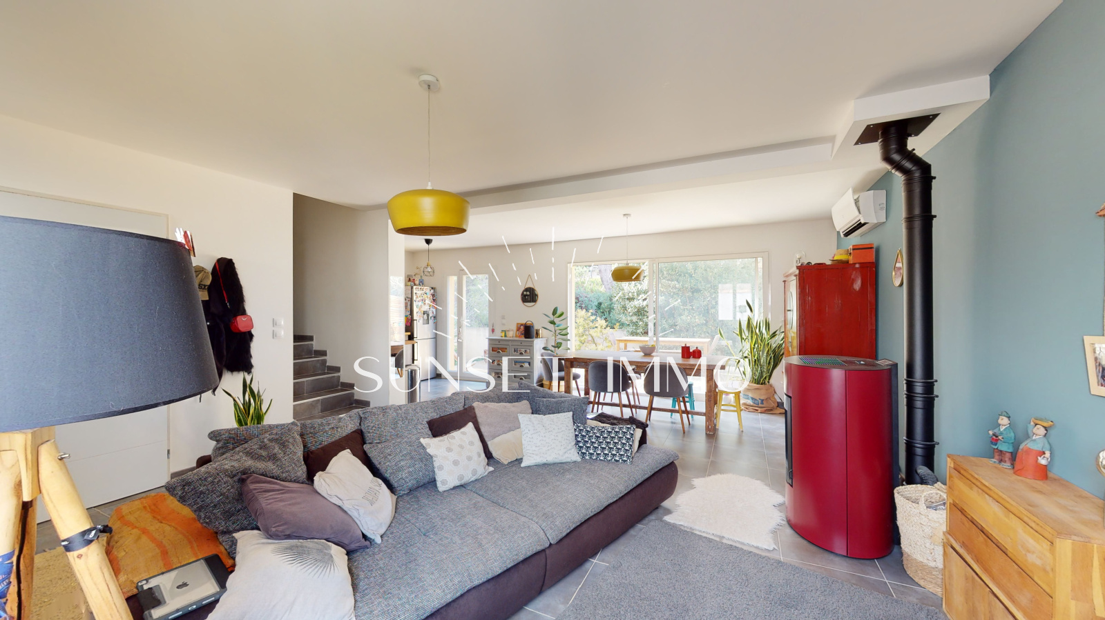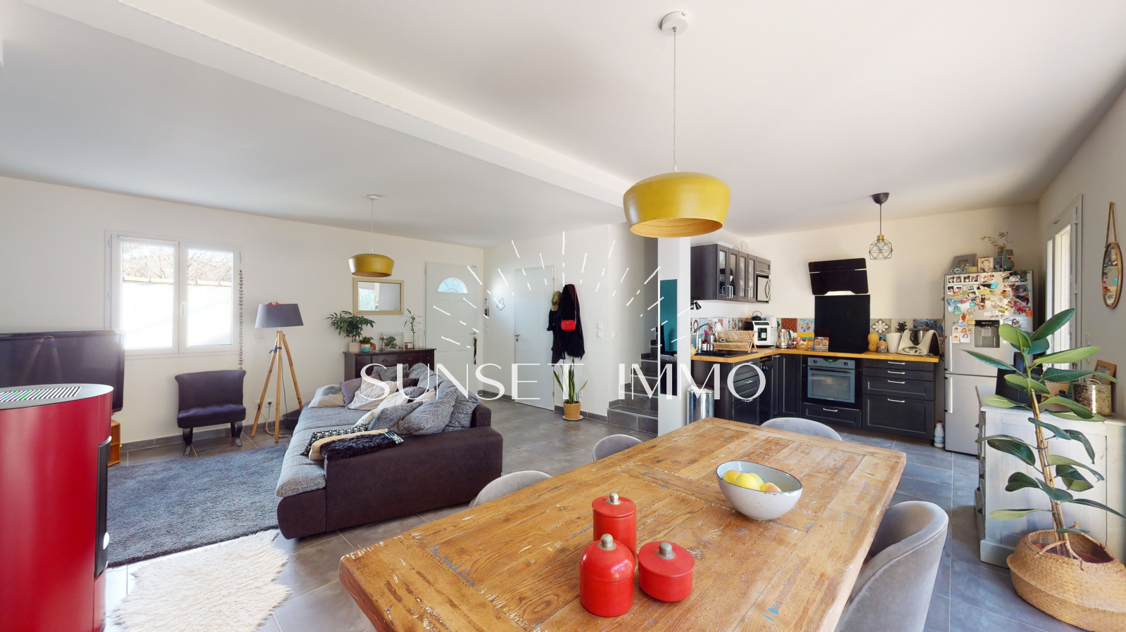 Vous entrez sur un chaleureux salon/séjour avec cuisine ouverte équipée d'environ 40m2 avec pôele à granules, climatisation réversible, stores électriques. Au même niveau, vous béneficiez d'un wc avec buanderie, d'un garage de 12m2 et d'une belle terrasse exposée ouest donnant sur le jardin.