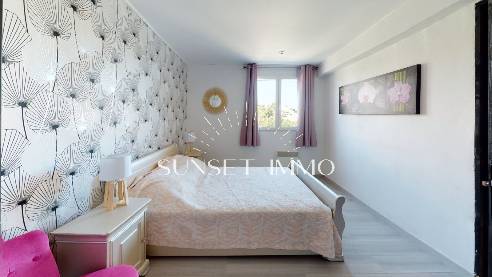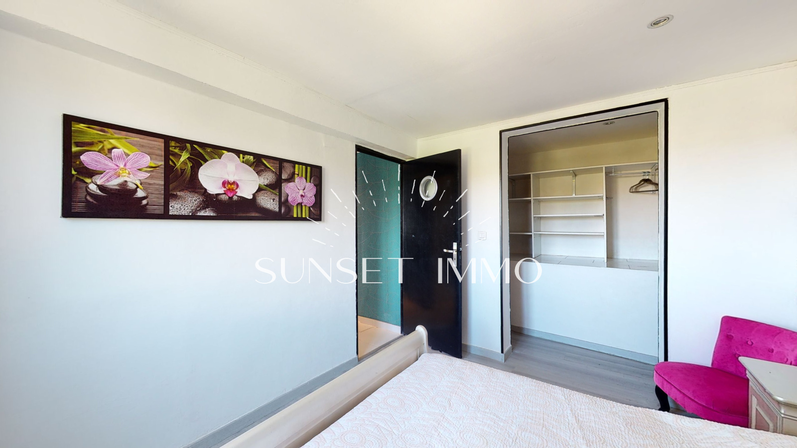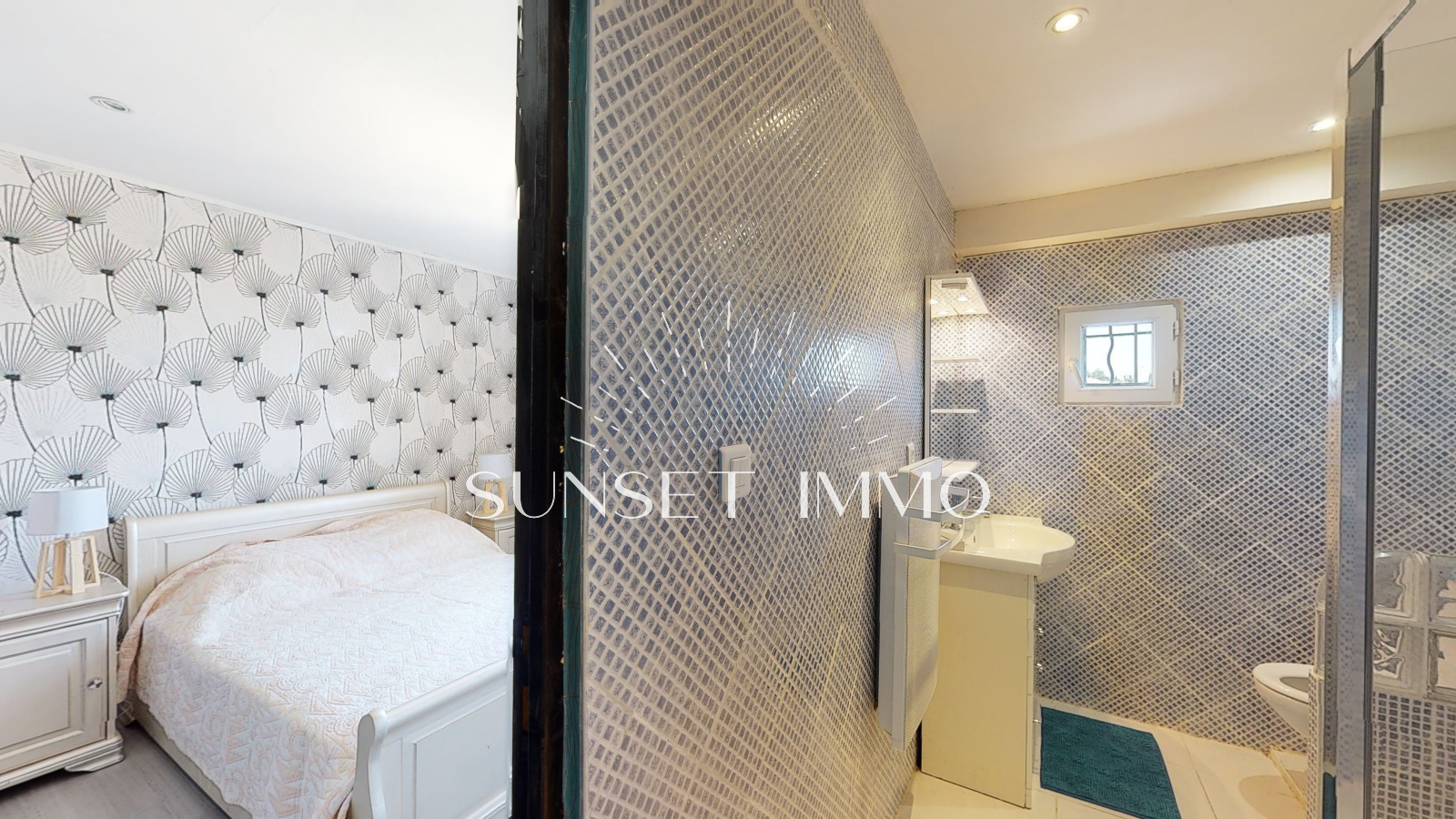 Au niveau en-dessous se loge un T2 avec salon cuisine, chambre, dressing, salle d'eau et wc. Cet espace s'ouvre sur la piscine et le jardin.