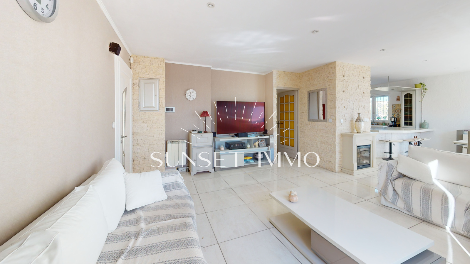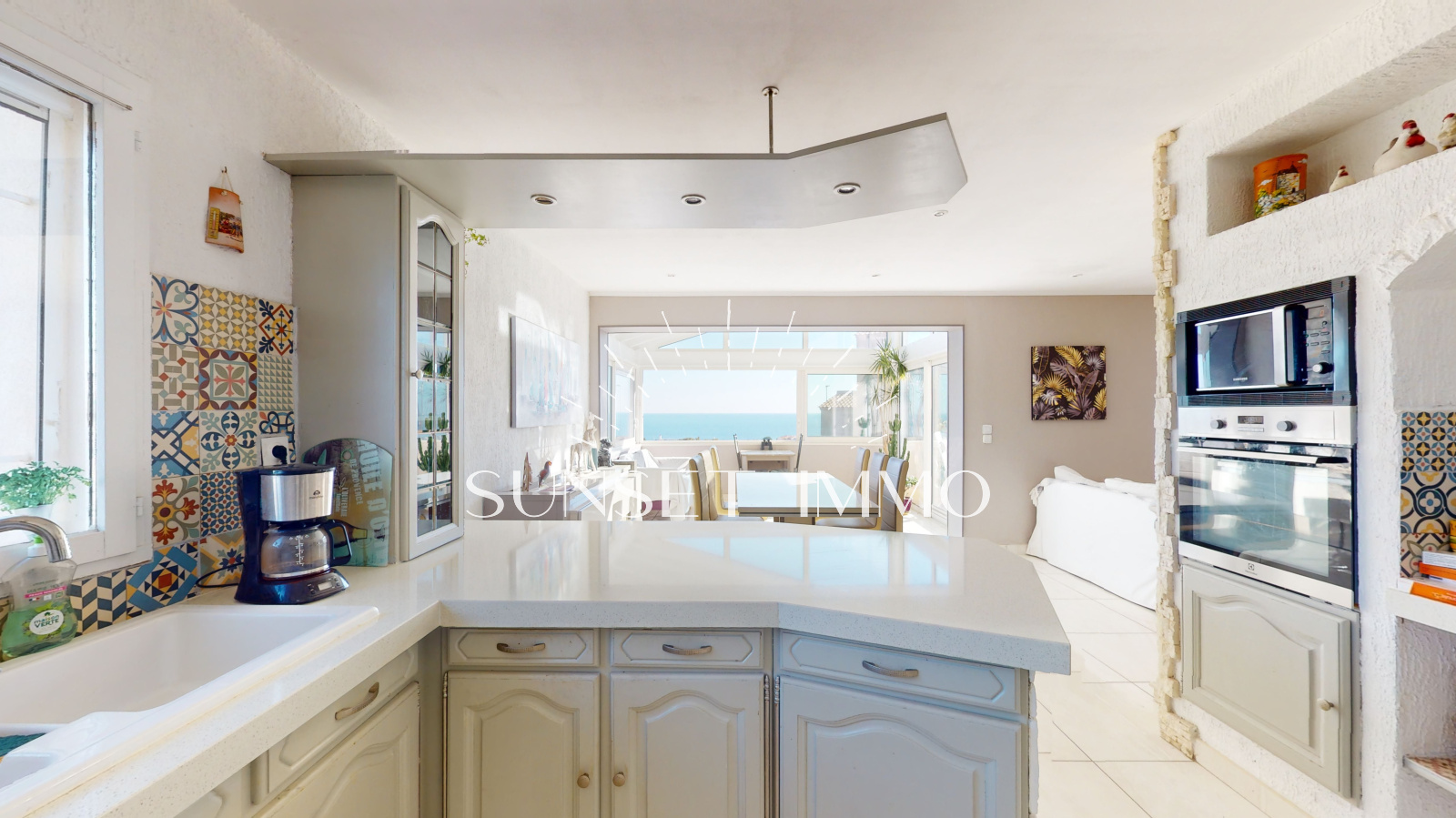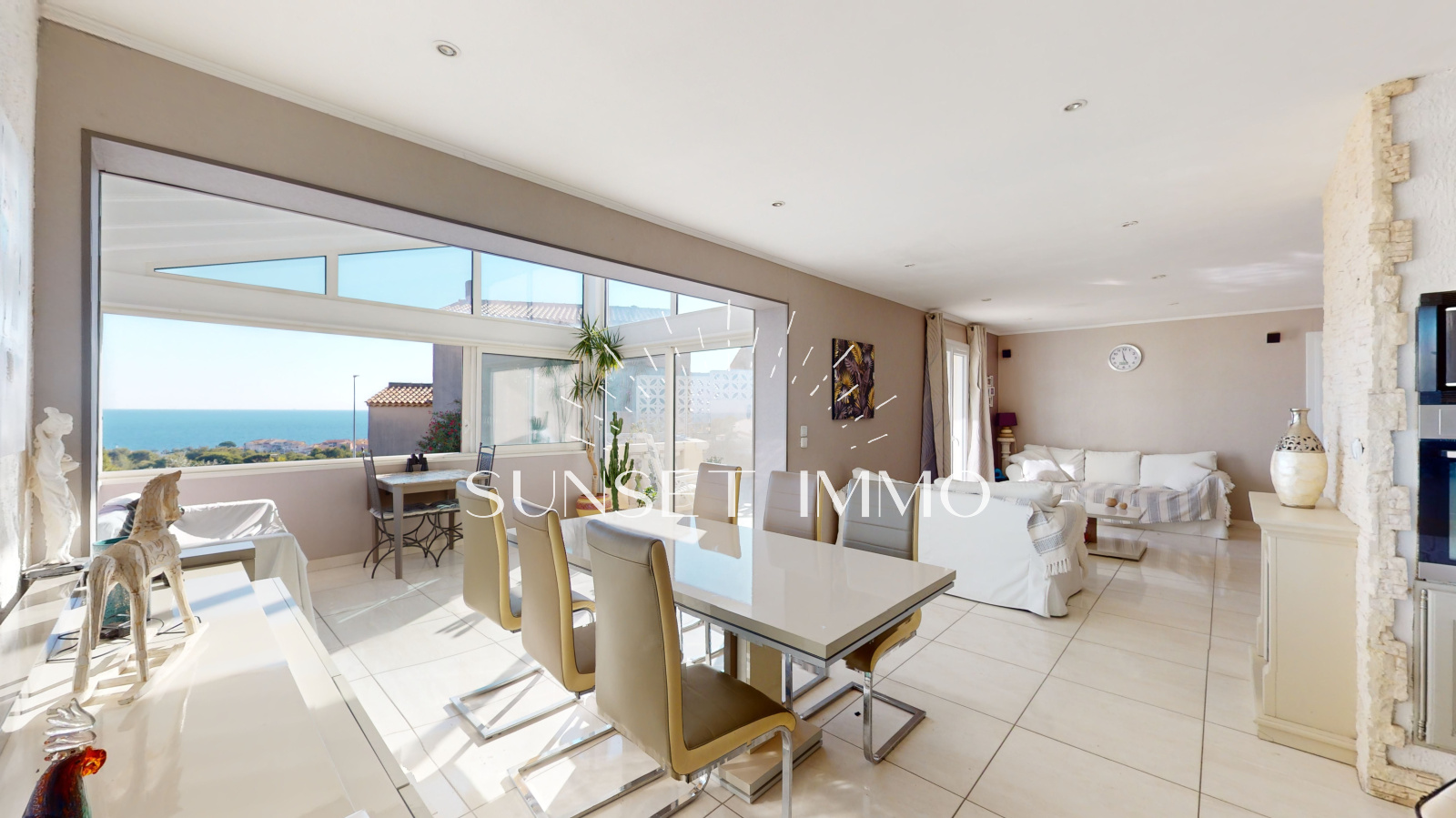 Vous trouverez de plain pied un grand salon séjour climatisé ouvert sur la cuisine, avec de larges ouvertures afin de beneficier de la vue mer. L'espace s'ouvre sur une large terrasse avec barbecue.