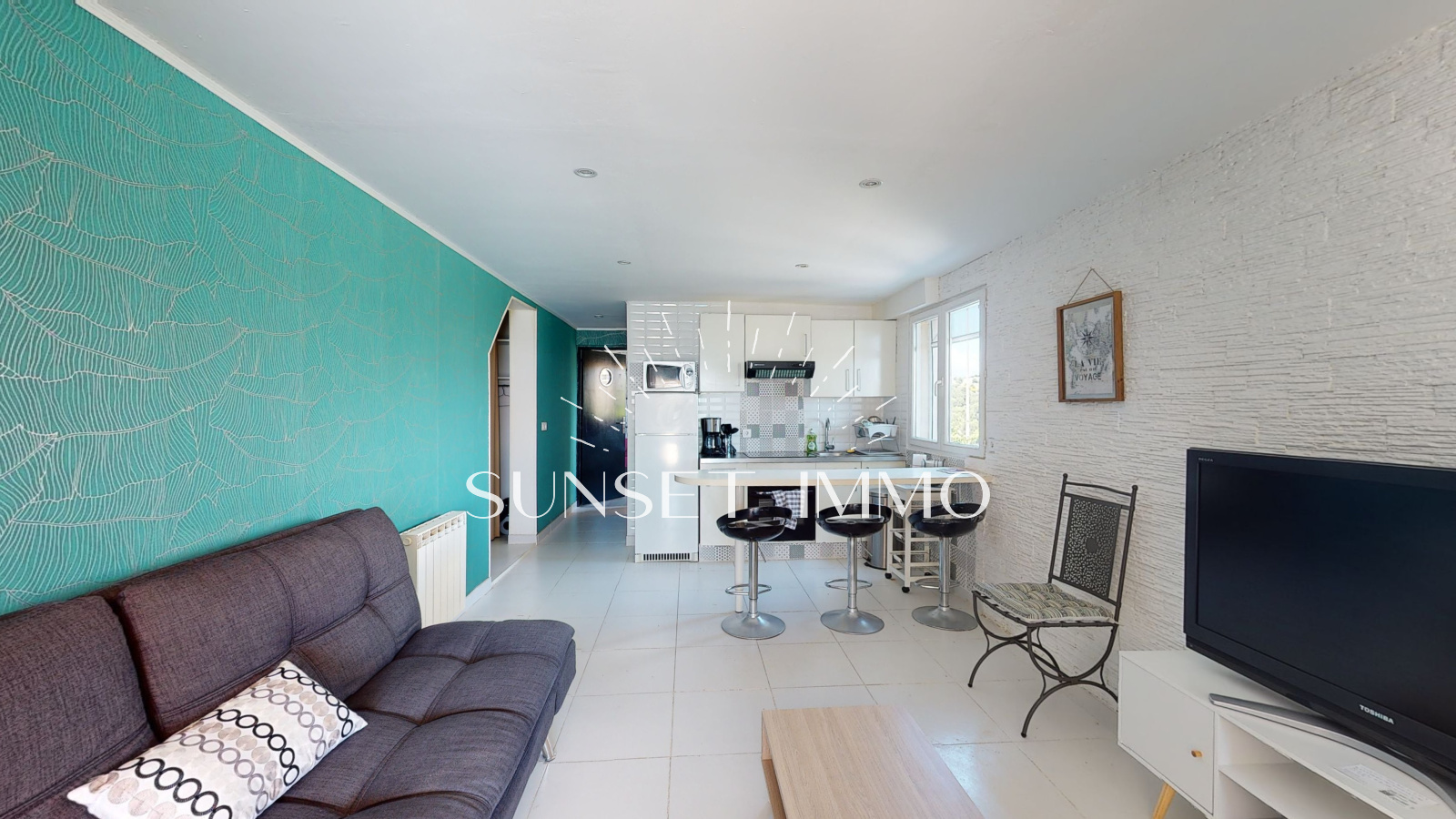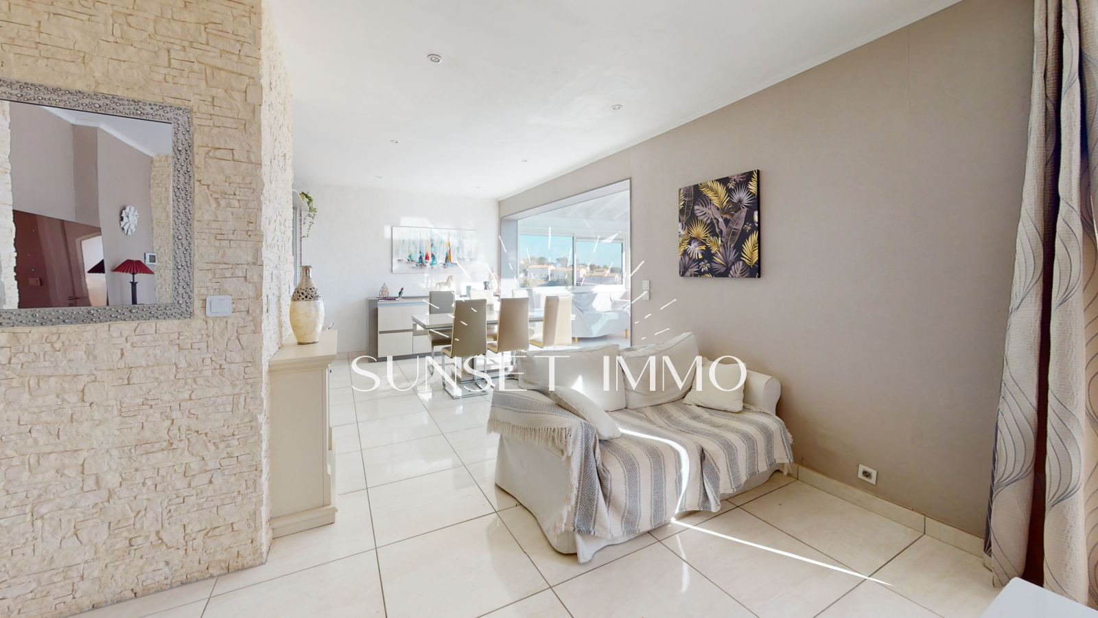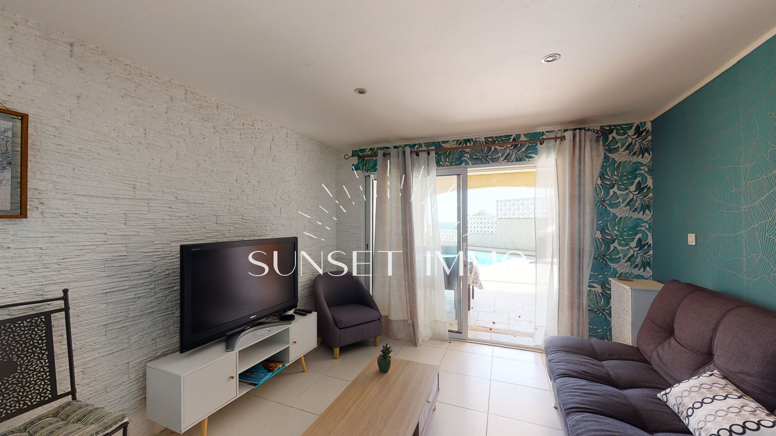 Vous trouverez de plain pied un grand salon séjour climatisé ouvert sur la cuisine, avec de larges ouvertures afin de beneficier de la vue mer. L'espace s'ouvre sur une large terrasse avec barbecue.