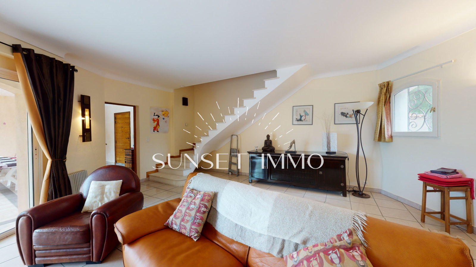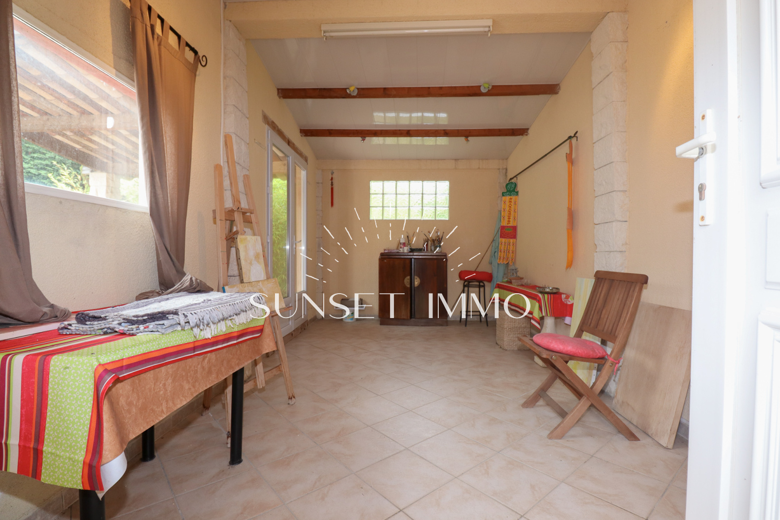 L'entrée coté Est donne sur la cuisine, la salle à manger, le cellier, le dressing et la véranda. Coté Ouest, nous avons un grand séjour avec cheminée, 2 belles chambres, une salle d'eau et un wc.